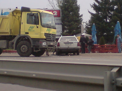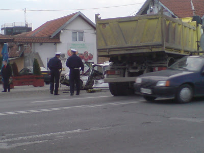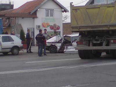 I sta reci vise.. Jos jedna saobracajna nesreca u nizu, i to opet na Zrenjaninskom putu. Krenuo sam Zrenjaninskim putem iz pravca Beograda ka Zrenjaninu (cisto radi orijentacije naglasavam), i vec negde blizu skretanja za Kotez, ponovo ja ulecem u guzvu. Ali to vec bi cudno, obicno je zastoj i guzva u suprotnom smeru, smeru ka gradu. Posao sam da kupim eksere. Posle 15-ak minuta klackanja u kolima, polako priblizavajuci se kanalu Sebes, uocava se policijska rotacija. Znam da sam poceo ovo da pricam kao neku pricu, i da ce neke mrzeti da sve ovo citaju da bi saznali kakva se nesreca dogodila, zato cu odmah da skratim. Kamion marke Mercedes kretajuci se iz pravca Zrenjanina ka Beogradu, presao u suprotan smer i smrskao automobil marke VW Passat karavan. Sobzirom da sam bio u prilici da napravim vise fotografija, videlo se da nema nastradalih, cak ni povredjenih. Ne znam kako, ali ni kapi krvi nije bilo, cak ni kola hitne pomoci se nisu mogla uociti. A prizor izgleda ovako: