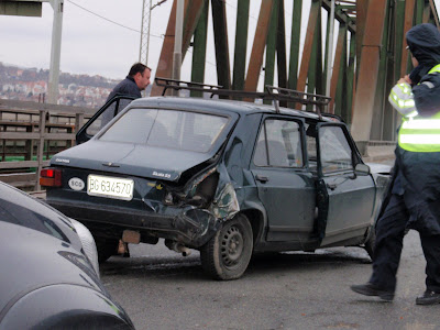 Elem, vracam se iz grada, prelazim Pancevacki most, iskljucujem se na Zrenjaninski put i naravno, ulecem u guzvu. U tom trenutku pomislih, ah opet usporen saobracaj zbog kise. Mada, iskreno, ne moze se reci da je bas padala kise, vec rominjala po malo, tek toliko da ovlazi kolovoz. Kome je poznato ovo iskljucenje za Zrenjaninski put sa Pancevackog mosta, zna da tu postoje dve vezane suprotne krivine.. I sta se desi kada se po vlaznom kolovozu ide vecom brzinom nego sto je propisano? Evo, upravo ovo..
