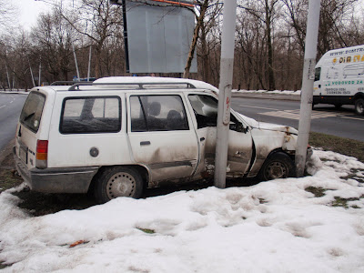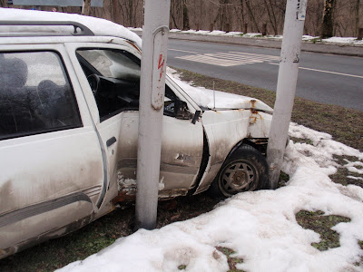 Materijal koji cemo Vam predstaviti dobili smo od Sase Radulovica (zabelezeno 27.02.2009.god.), studenta Visoke Skole Elektrotehnike u Beogradu. On redovno prolazi ulicom Bulevar JNA u kojoj je zapazio "parkirani" automobil u blizini Fakulteta Organizacionih Nauka (FON) kod broja 215. Naime, radi se o saobracajnoj nesreci. Zbog neprilagodjene brzine a i losih uslova na putu (u tom vremenskom periodu), automobil je izleteo sa kolovoza i "navukao" se na banderu. Po nasoj pretpostavci a na osnovu slika, mozemo tvrditi da teze povredjenih nije bilo.